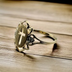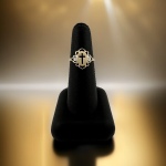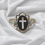14K Yellow Gold 0.01 ctw – 2 Total Round Natural Diamond – Flat Satin Finish Plate Center with Cut-Out Cross & Scroll Edging Fashion Band